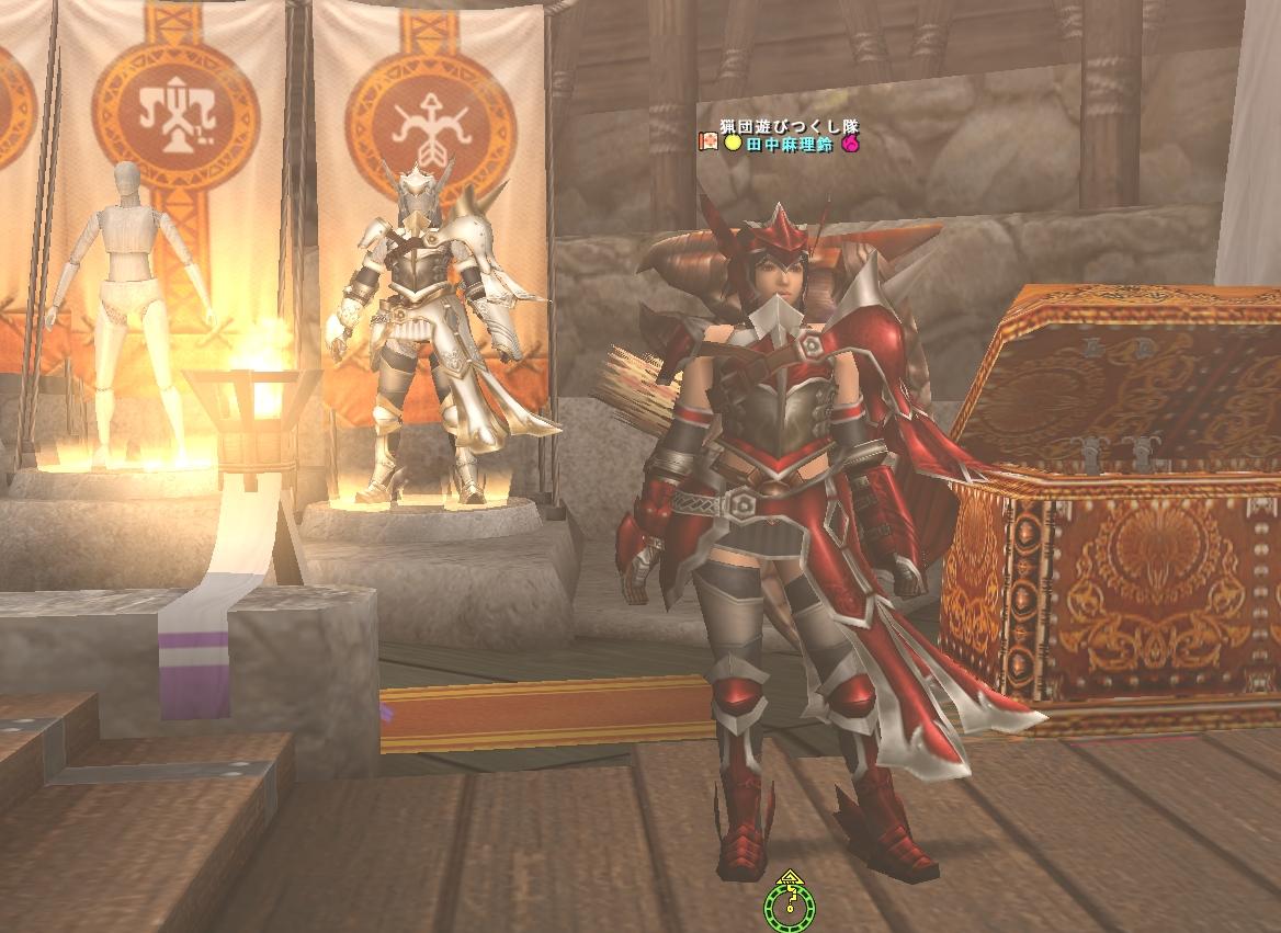 昨日の記録 朝のボーナス試練は下位キリンなのでパスして弓の秘伝装備を作成してみた。シュミして出した結論は白3部位紅2部位、見た目的にどんな組合せにするか迷ったので 紅白10点作製 乏しい美的センスで決定して強化したのが 『ピンボケで分りにくいので明日に張替え予定』3部位がレベル7まで最終強化済み、残り2部位が最終強化すると攻撃特大になるけど現在のところHC剛種クエストでは覇種防具3天嵐1の現在使用装備との攻撃力は540対547と微妙に上回っているけど見切りで会心率10%違うから総合火力では...