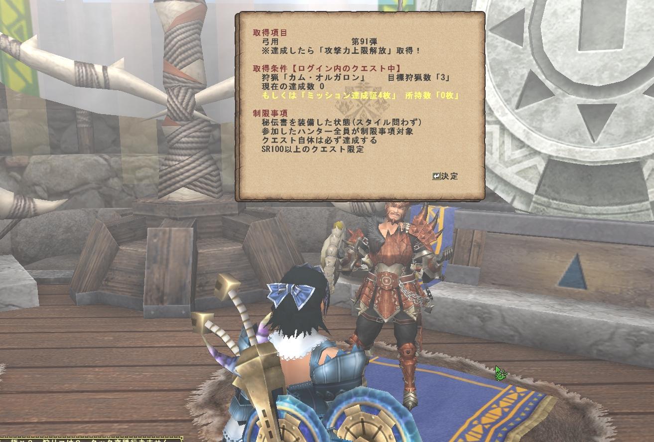 昨日の記録 朝のボーナス試練は上位グラビで全くやる気無しで、人もまばらで他のクエスト募集しても集まりそうも無い。弓マイミッション進めてついに 対象が凄腕クエストになり剣士装備ならまだしも弓ではガロンに敵わない、来週のネカフェに行ったときにフラウちゃんに頼ろうと計画。 午後にインしてボーナス試練の錆びクシャ、最初のパーテーは1時間限定のパーテーで青い大秘伝ランスさんにハンマー3人、30分ほど休んで装備自由パーテーに入ったら麻痺剣笛・ゴゴ片手・ハンマーにMも麻痺剣ハンマーでどちらもスタンや麻痺拘...