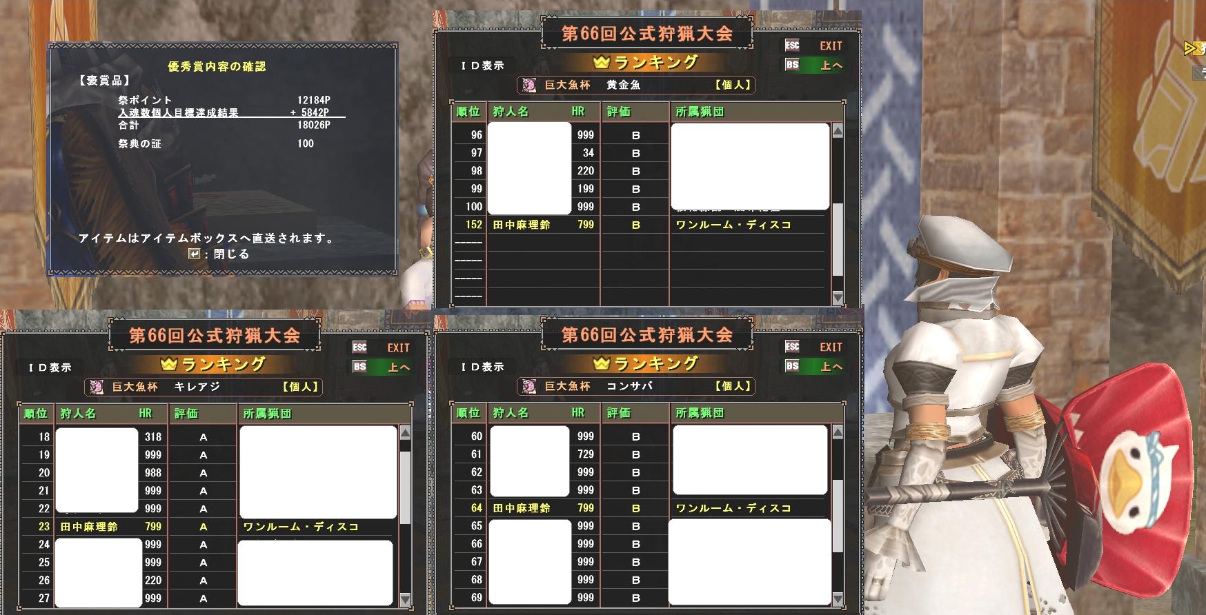 昨日の記録 朝にMでインして最後のボーナス試練剛ガルフを1時間ほどして入魂祭終了大秘伝お二人にグリーンネームさん笛でHCチケットも毎回9枚で美味しい入魂 7時だけどログアウト。 夕方インしてメンテは時間通り終了したこと確認、恒例の不具合はシェンテイエンに関するものらしいので自分には関係なし。盛り上がりに欠けた?狩人祭りへのテコ入れがもはや定期配信に昇格した終わりなき襲撃とナワバリ2本・・・・HRP(SRP)たっぷりクエストも継続配信で秘伝書取得してG級ハンターへ引き上げようとカプコンの自己満足...