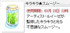 ホワイトデーっぽいイベントがきてました。 バレンタイン時に作れなかったチョコが作れるようでした。 が、今年は結局1個も作りませんでした(;´Д`) 毎年ビターチョコが金づるなのにな…うおぉぉん!!_| ̄|○ きっとあとイベントが一週間長ければ頑張っていた。かもしれない。 お菓子作りは多分来年頑張りますです。 今回のイベント回復材はスムージーでしたね。 ドーナツとかよりも健康に良さそう。めっちゃ青汁!! 連打しても糖尿病にはならなそうですが、 飲みすぎるとな...