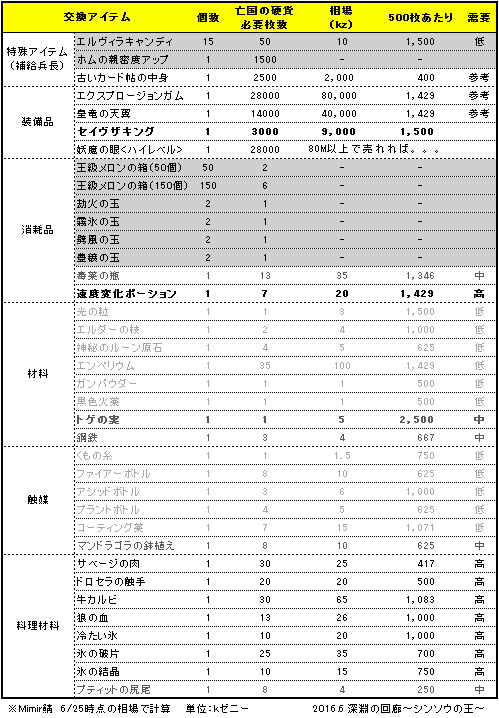 深淵の回廊イベントに参加し、mobを討伐するともらえる亡国の硬貨。 そろそろアイテムに交換したいな〜と思ったので、何が効率いいのか計算してみました。 ※Mimir鯖 6/25時点のだいたいの相場(最安値または買取価格)で計算※ ※装備品は取引数が少ない(orない)ため、参考値となってます。 計算してみてわかったけど、みんなが交換しそうなのはちゃんと同じくらいになってるんですね。。。 ガンホーもすごいけど、相場って不思議。 うちの鯖はまさかのトゲの実が最高値でしたが、需要を考えると・・・(´・ω・`) 材...