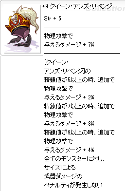 こんにちは。 ブログサボり気味のマツチアです。 最近忙しいのよ、昨日はチャリンコパンクするし!(予定外 さてさて、 精錬祭りで未刺しの破戒僧の数珠がお高く売れたので、 一昨日かその前に欲しかったあの装備を衝動的に買ってしまいました。 +9クイーン・アンズ・リベンジ!! はじめはデビリンcと超迷っていたんです。 でも「デビ肩じゃないとダメな場面あったっけ?」と思ったのと、 精錬祭り中復帰したギルメンがデビを移し替えたいと言っていたので 倉庫の肥やしになっていたエスランをどうぞし...