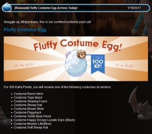 JUGEMテーマ:オンラインゲーム <Fluffy Costume Egg> コスチュームは「見た目だけ変わるネタ装備」です 箱は一個300KP。全部Lv1から全職装備可能です <Overseas Care Package 2> 箱は一個300KP。「当たり」と思われるものは・・・ 精霊のタイツ スパルタカス