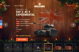 JUGEMテーマ:オンラインゲーム 日めくりカレンダーセール二日目はオーストラリア(よって英国扱い)のTier6 中戦車AC4 Experimental(4番目に開発された試作車両) Aはオーストラリア、Cは巡航戦車(Cruiser)の略です。 砲はファイアフライと同じ物で強力。装甲は薄く、機動性が高いのが売り。 Tier6 という立場が微妙な一品。同位Tier6や上位Tier7の独ソ中戦車と対決するとスパスパ装甲を抜かれてお陀仏ですが、トップTierのマッチングなら格下戦車を蹂躙可能。 三日目は中国のTier7 軽戦車62式。 こん...