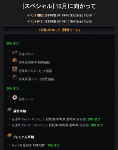 JUGEMテーマ:オンラインゲーム 10/1-11/1月間セール 目玉はSpecial Value Pack 日本円で約千円かな? 10/3-10/10週初めスペシャル M10偽装パンターが再び登場w 10/3-10/7駆逐戦車フォーカス Tier2〜5で50%オフは魅力的です