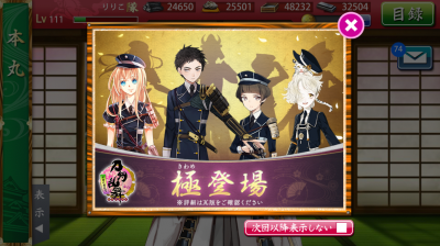 JUGEMテーマ:オンラインゲーム きたあああああ!極! やっぱり短刀ちゃんからだけど! まずは乱ちゃんに修行に行かせました。 どんな風になって戻ってくるかな♪ ここで近侍ボイスとは驚きだぜぇ...... そしてそしてーー 新マップ! ちょwwwボスマスどこwww っていうか死中みたいになったりしないよねこれ…? とりあえずチーム・節穴で挑んでみましょー。 おお!新背景新BGMいいね!!! チーム・節穴が索敵成功...だと...!? 「愛国見回り隊」に突っ込み隊。 たかはやくんいな...