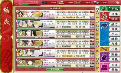 JUGEMテーマ:オンラインゲーム やっと6-2にKBCマークを付けれたので、「おっしゃあもっかいお前らと戯れてやんよ!」と息巻いてたのに...... 付けた直後に2回会ったきり奴等と会ってません。 刀装ガンガン吹っ飛ばして周回してんのに、相変わらず日課の5回分会えません。今日なんて0回ですよ。どこにいるんだよ検非違使!?こんっのニート共がぁ!!! 1・2・3面でKBCと戯れてた所為でレベルが微妙な子たちのレベルを揃え終わったので、次からは夜戦主力軍でボスマス目指して、lv40台の短刀・脇差・打刀には只管KBCと会うための...