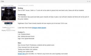 JUGEMテーマ:オンラインゲーム Safe to +7 certs がRMTに利用されているので露店出品不可能に修正 ヴァレンタインイベントは継続中 旧正月(Lunar New Year)イベント 内容は2012年と同じ 遅まきながら「劇場版ガールズ&パンツァー」を観に行きました。継続高校が飄々とした味を出していて面白かったw最初にエキシビジョンマッチで、40tもあるチャーチル重戦車がなぜか体感時速40kmで走行したり神社の石段を昇り降りしたりするのですが、『どんな高強度素材で街全体が作られているのか?』は禁句です。普通に実物が日本のアスフ...
