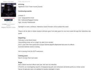 JUGEMテーマ:オンラインゲーム 時計塔の賞金看板にNightmare(モード)追加? ヴェインスのスポットライト(モンスター数倍増)が継続 February Lucky Box 販売終了。March Groove Pack は来週の予定。 Desocketing book が取引不可能(アカウント縛り)に 2015 Lunar New Year quest やっと終了。Baphomet hat の期間限定特殊効果が無効に。何か絵がないと寂しいので、ファンアートガルパンのダージリンさんは永久に不滅ですっ!