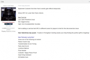 JUGEMテーマ:オンラインゲーム 日本時間2月12日AM3:30〜AM10:00の6時間半がメンテです。 バレンタインデーイベントの予告が出ました。詳細は後日 前述のFebruary Lucky Box 発売開始。300KPは高いなあ・・・ あと、正式名はHeart's Foundation Lucky Box の模様w やっと公式HPにも載りましたCostume Baphomet Hat が露店で3Mで売っているものの、目新しい装備品が売りに出ていないのでウインドウショッピングは停滞中。(;^ω^)