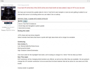 JUGEMテーマ:オンラインゲーム 1月末にDDOS攻撃による鯖缶が有った様で、該当時期にVIPチケットを持っていた人に対して2日分の補填(期間延長)措置が行われます。 HEROES TRAIL 3 Update が実装 1)インスタンスダンジョン 2)ワールドマップとナビの更新 3)露店の上限拡大ゲフェンタワーのMVPモンスター召還NPCに変更が有るようですが、文章を読んでも意味不明w 絵がないと寂しいので「最弱無敗のインフィニットストラトス」(嘘